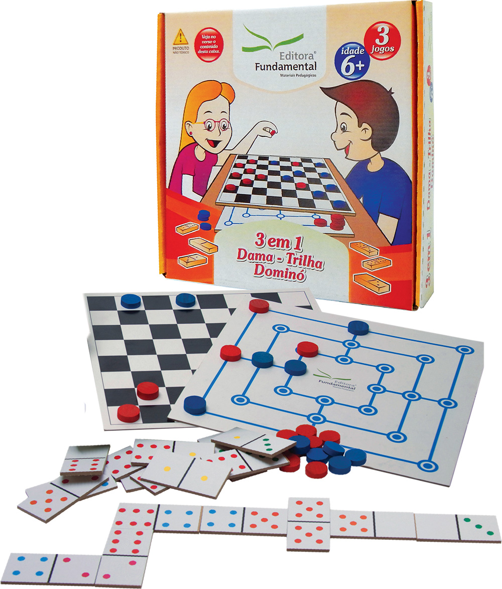 Contém 3 jogos: Dama / Trilha / Dominó sendo: 2 tabuleiros (Trilha – Dama) em MDF tamanho 23 x 23 x 0,3 cm + 34 marcadores em EVA; 28 peças MDF de Dominó Pingos coloridos tamanho 7 x 3,5 x 0,3 cm.